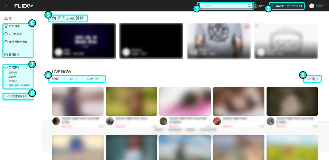 - 전체 라이브방송의 정렬을 설정할 수 있습니다.